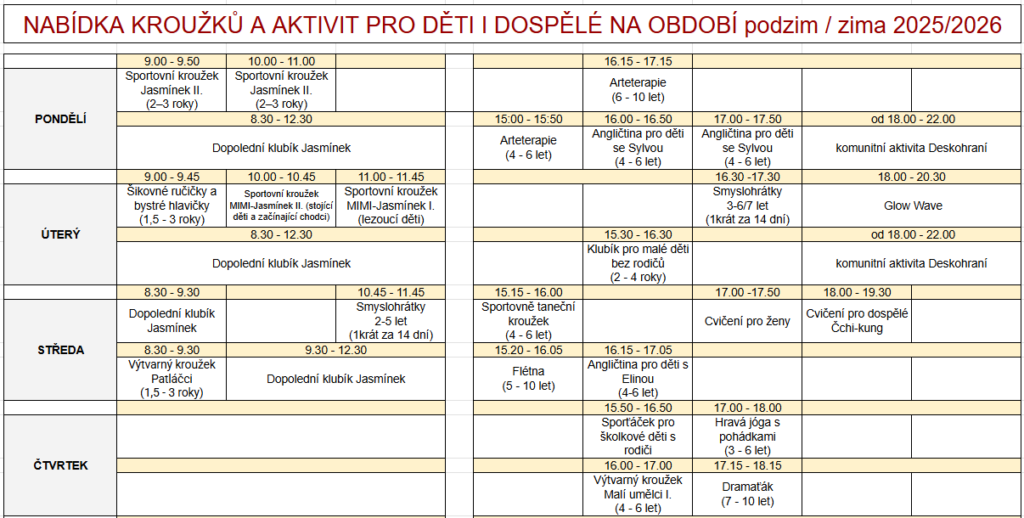 Na období podzim, zima 2025 vám nabízíme několik pravidelných kroužků pro děti i kurzů pro dospělé.